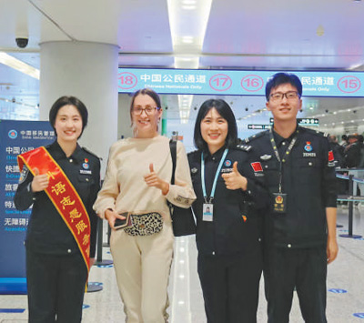 外国游客在杭州萧山国际机场国际服务中心,为便捷的入境服务“点赞”。李 玎摄