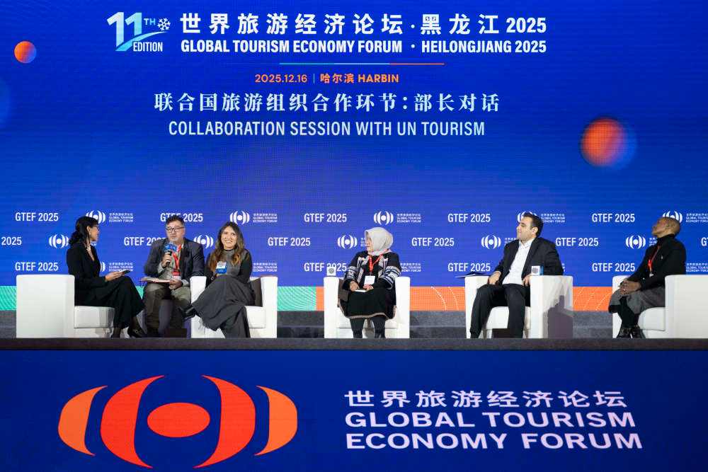 12月16日,在世界旅游经济论坛·黑龙江2025现场拍摄的联合国世界旅游组织合作环节的部长对话。新华社记者 张涛 摄
