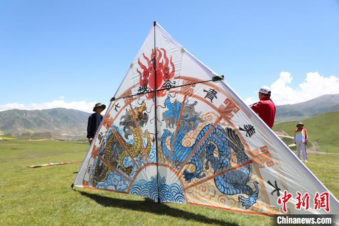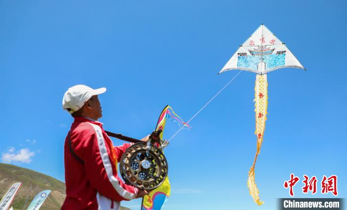 图为选手放飞手绘的湟源丹噶尔古城风筝。