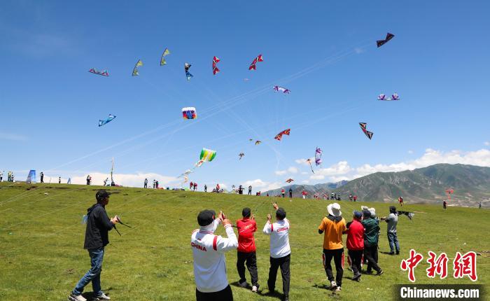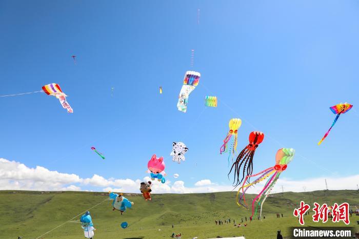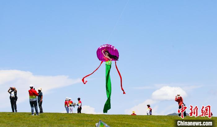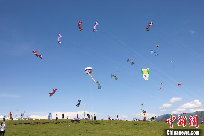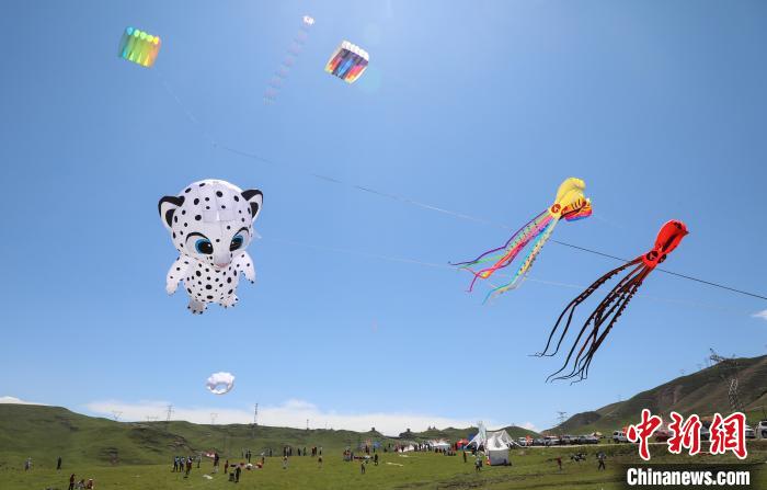 图为各类风筝飘舞在青海日月山蓝天绿草间。