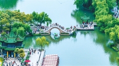 随着“苏超”破圈,江苏扬州借势发力,推出“看球+赏景”文旅套餐,图为游客在瘦西湖风景区赏景游玩。