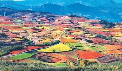 冬日艳阳下,云南省昆明市东川区红土地镇独特的红土地景观,吸引各地游客前来,也带动周围百姓增收。