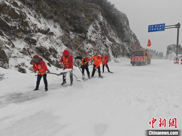 1月22日,广西桂林全州县公路养护中心工作人员在高寒山区道路进行融雪保畅作业。