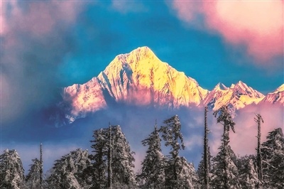 冬日里,四川贡嘎山“日照金山”景观与森林雾凇交相辉映。王岗坪景区供图