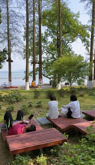 近日,武汉东湖听涛景区的“躺椅”火了,一种“在天然氧吧躺平晒太阳”的武汉玩法出现——约上三五好友,在湖边的阴凉处躺平,吹着湖风,听鸟鸣声,将“松弛感”拉满。