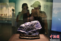 7月16日,四川成都,参观者观看青金石万松山馆图山子。当日,“青·韵——文物里的中国传统色彩美学”特展在成都金沙遗址博物馆启幕。此次展览汇聚了故宫博物院、湖南博物院等20余家文博机构的200余件/组青色系文物,尽显文物里的青色之美。中新社记者 王磊 摄