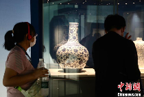 7月16日,四川成都,参观者观看乾隆款青花天球瓶。当日,“青·韵——文物里的中国传统色彩美学”特展在成都金沙遗址博物馆启幕。此次展览汇聚了故宫博物院、湖南博物院等20余家文博机构的200余件/组青色系文物,尽显文物里的青色之美。中新社记者 王磊 摄