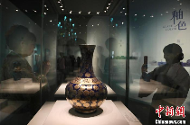 7月16日,四川成都,参观者拍摄宣统款霁蓝描金团花瓶。当日,“青·韵——文物里的中国传统色彩美学”特展在成都金沙遗址博物馆启幕。此次展览汇聚了故宫博物院、湖南博物院等20余家文博机构的200余件/组青色系文物,尽显文物里的青色之美。中新社记者 王磊 摄