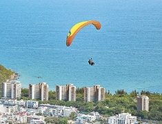 游客在海南陵水红角岭国际滑翔伞飞行营地体验滑翔伞飞行。