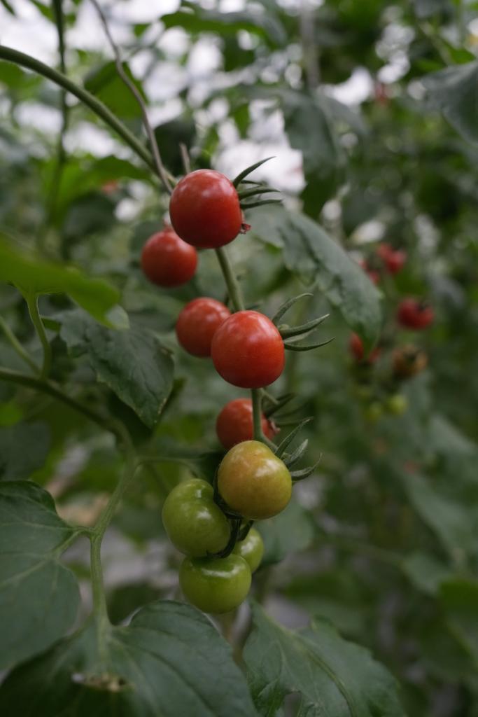 湾底村智能化玻璃温室里的七彩番茄可供游客体验采摘。