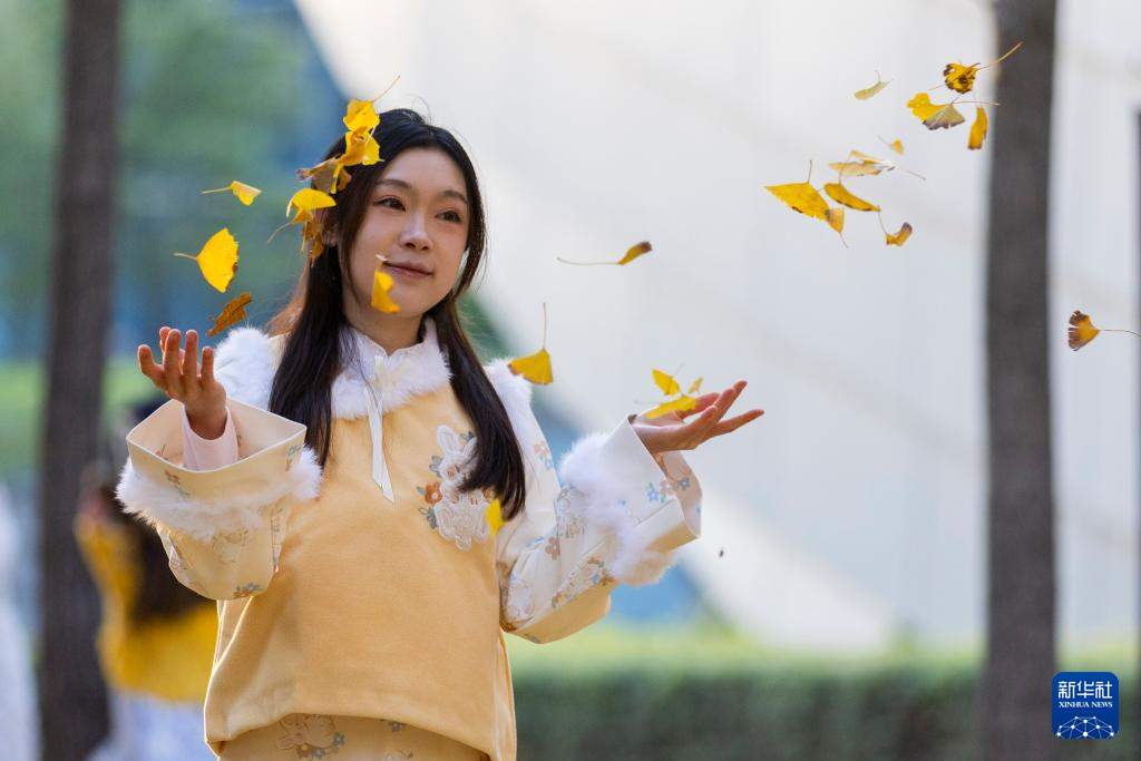 12月15日,市民在上海国际舞蹈中心附近留影。近期,上海迎来银杏最佳观赏期。银杏披上“金黄”的外衣绚烂夺目,吸引市民和游客拍照打卡。