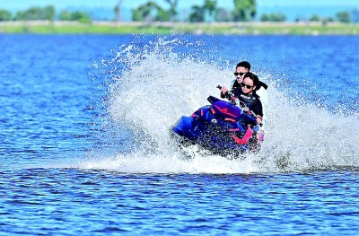 黑龙江哈尔滨松花江一处江面,游客在体验摩托艇项目。