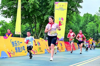 四川眉山,家长和孩子在参加“六一”亲子跑活动。
