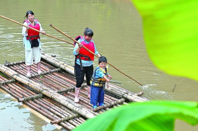 在云南景洪市基诺山基诺族乡,家长和孩子体验竹筏划船。
