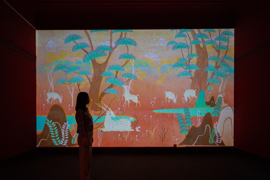 观众在天津数字艺术博物馆通过数字技术与敦煌壁画作品互动(2023年11月24日摄)。