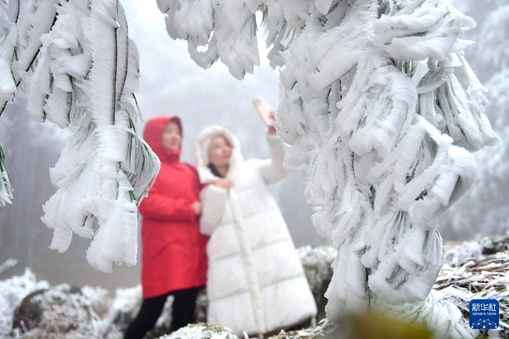 12月15日,游人在云南省文山壮族苗族自治州丘北县舍得乡欣赏雾凇美景。冬日里,银装素裹的山川万物呈现出别样美景。