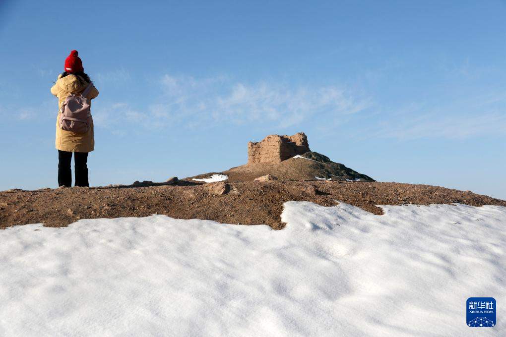 12月14日,游客在雪后的甘肃省敦煌市阳关景区游览拍照。冬日里,银装素裹的山川万物呈现出别样美景。