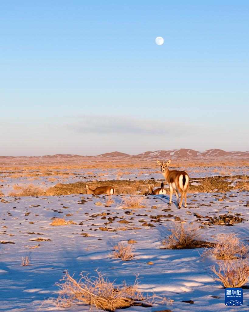 12月14日,在甘肃阿克塞哈萨克族自治县,几只鹅喉羚在雪原上漫步觅食(无人机照片)。冬日里,银装素裹的山川万物呈现出别样美景。