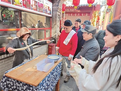 在陕西西安永兴坊街头一家手工艺品店铺,梅毕娜按照贴在墙上的年份生肖对照表,找到了自己的属相“牛”。只见吹糖人师傅挖出一小块糖稀,轻轻揉捏,小心吹制。站在旁边的中国朋友打趣说:“开始吹牛了。”梅毕娜笑着回应:“我不会吹牛,但是我属牛。”说罢,便拿出手机扫码付款。