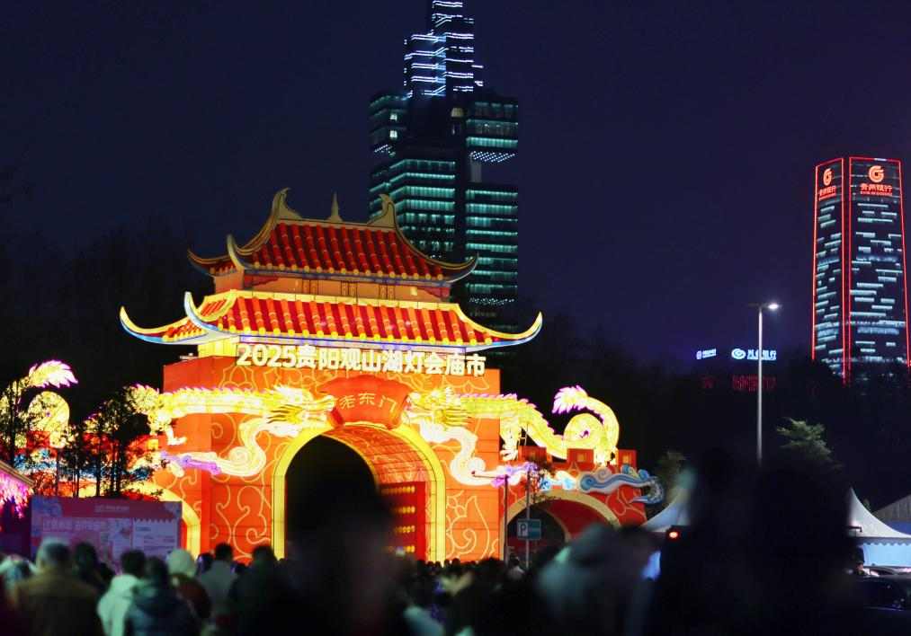 1月30日,游客在贵州贵阳观山湖灯会庙市上参观。