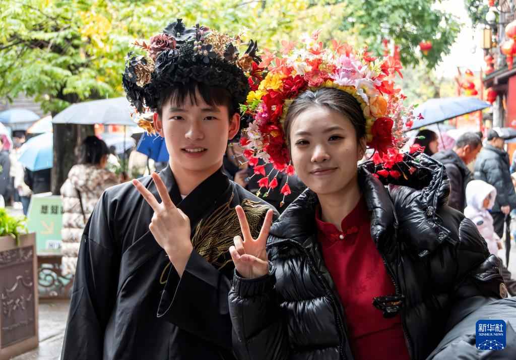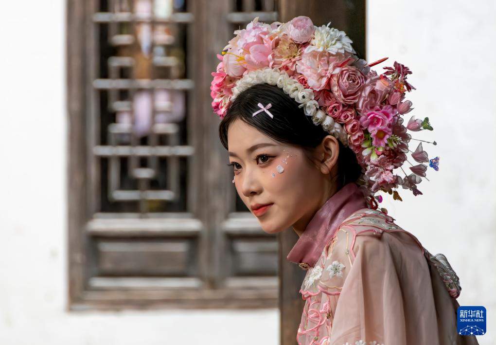 一名游客头戴“簪花”在福州市三坊七巷打卡留影(2月3日摄)。