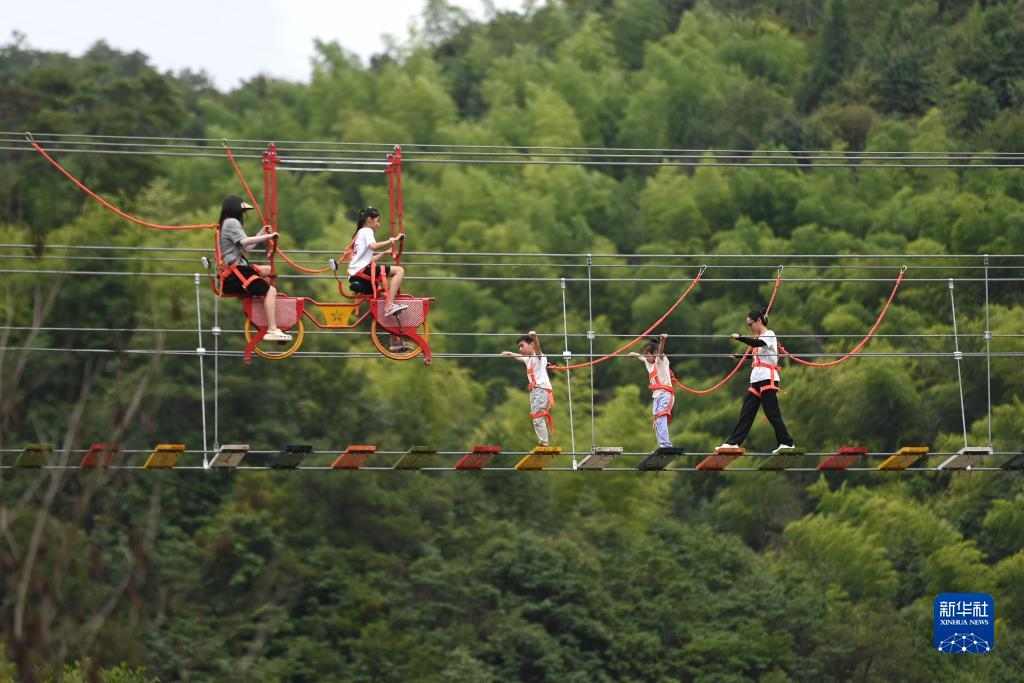 8月20日,游客在余姚市四明山镇北溪村体验高空项目。